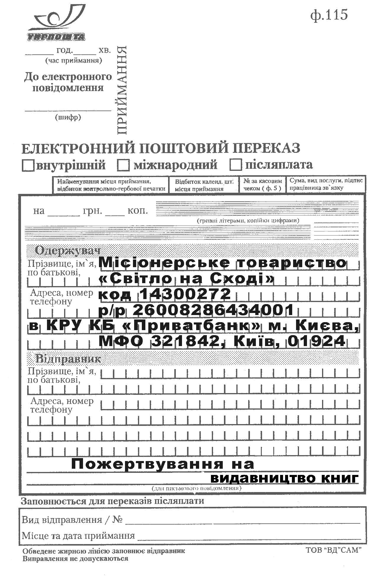 3. Почтовым переводом на адрес миссии: