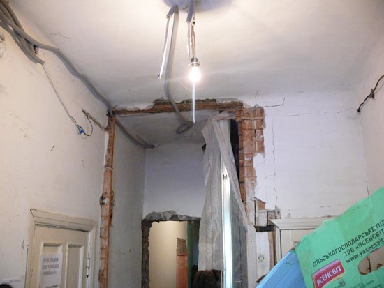 Будівля притулку, здається, переробляється та ремонтується до зими, і видно, що вона взагалі не пристосована була до життя. Стіни обшиті гіпсокартоном, освітлюють приміщення прості лампочки, в деяких кімнатах навіть одвірків немає, не те, що дверей.