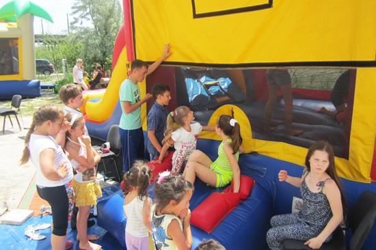 Також до нас приходило багато дітей: вони стрибали на батутах, брали участь у конкурсах та естафетах, слухали біблійні історії та навчалися біблійним принципам. Їхні відповіді на питання показували, що вони слухали уважно і з цікавістю. У нас з’явилися помічники серед дітей – підлітки Христина і Вероніка, які допомагали в естафетах, а також 12-річний Сергій, який стежив за порядком на батуті, і займався з малюками. Останнього дня ми подарували Сергію дитячу Біблію та подарунки, і молимося за нього, щоб він став справжнім Божим служителем. З багатьма дітьми ми потоваришували, а деякі виявили бажання молитися, щоб ми знову приїхали з таким служінням.