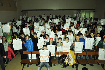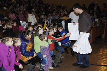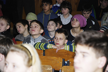 Наступного дня нас очікувала зустріч із 300 діток із сімей пересельців, які зараз проживають у Дружковці. Повна зала дітей… і знов зацікавлені оченята… і знов дитячий сміх… і гучні аплодисменти… і, звісно ж, подарунки.