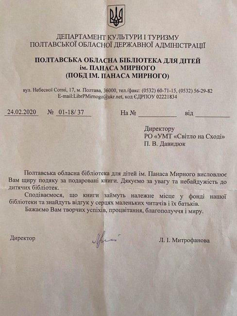 Написала нам в Фейсбук одна бібліотекар з Харківської області (скорочено перекладаю): «...Багато чула про вашу організацію. Нещодавно дізналася, що ви даєте можливість дітям знайомитися з християнською літературою. Хочу попросити вас подарувати і в нашу бібліотеку, якщо будете так люб’язні... »