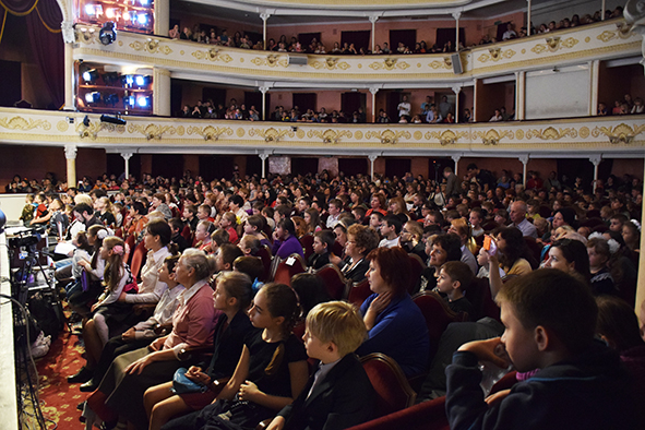 І це були ще не всі бажаючі… Тому ми від початку запланували показати дві однакові вистави, бо зала ну ніяк не могла вмістити одночасно 2000 дітей (і це не враховуючи батьків і вчителів, які супроводжували цілі класи!), адже й на другий показ вистави прийшло не менше тисячі дітей, яких ми ледве розмістили у глядацькій залі!