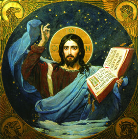 Картина. У післяіконоборній Візантії стає обов’язковим (канонічним) на склепінні купола образ Христа-Пантократора (грец. Pantokrátor – Вседержитель). Пантократор - це Христос Страшного суду, другого приходу. Є різні зображення Христа: Дитини, Отрока (Еммануїл), Христа на іконі “Зішестя Святого Духа на апостолів”. Образ Христа другого приходу наділений певними атрибутами влади, часто Христос зображується в оточенні ангелів, херувимів і серафимів. Про Другий прихід знаємо, що Христос прийде у силі і славі - саме це значення має іконографія образа Бога-Судді, Який знає всі діла людини. Одні з найкращих зразків цього зображення - у Софійському і Володимирському соборах у Києві (у Володимирському соборі - розпис Васнєцова). У Росії мозаїка отримала популярність після того, як сподобалася імператору Миколі Павловичу, коли він побачив її у Монреальському соборі в Італії. Всю середину собору вкривають мозаїчні картини візантійської роботи, створені протягом десяти років сицилійцями, які наспіх пройшли навчання в Константинополі (через те їм бракує витонченості, влаcтивої мозаїкам Палермо і Чефалу). Мозаїка Христос-Вседержитель цього собору якщо не рідна, то точно двоюрідна сестра мозаїки Васнєцова у Володимирському соборі. Васнєцов у розписах Київського Володимирського собору прагнув воскресити дух візантійських та староруських фресок та ікон. Перед початком робіт здійснив подорож до Італії для ознайомлення з візантійськими мозаїками і монументальним живописом епохи Відродження. Приніс у давні традиції проникливе ліричне начало. Стилістика розпису Володимирського собору близька до російського варіанту стилю модерн. Євангельський епізод. Об.4:2-3; 5:9. “І я бачив в правиці Того, Хто сидить на престолі, книгу, написану всередині й назовні, і запечатану сімома печатками".
