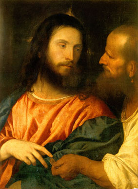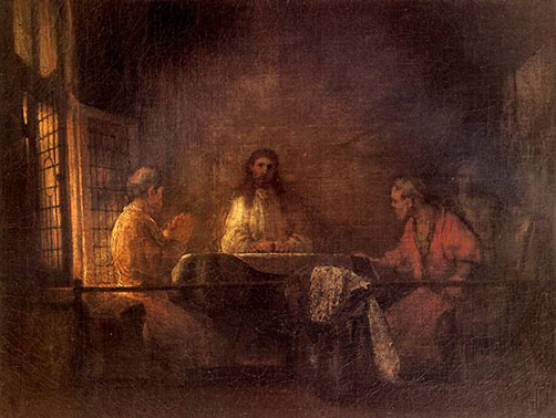 Євангельський епізод. Мт.25:35; Мк.16:12, 13; Лк.24:13-35. Після Свого воскресіння Ісус з’явився двом своїм учням, які йшли з Єрусалиму в Еммаус і обговорювали події останніх днів: страту, поховання Ісуса Христа і Його незрозуміле зникнення з гробу. Коли дорогою до них приєднався Христос і зацікавився їх бесідою, вони не впізнали Його. Коли прийшли в Еммаус, учні запросили Ісуса Христа з собою. Під час вечері “пізнали Його в ламанні хліба”, але в цей момент Христос став невидимим. Чому вони не могли Його впізнати відразу? Тим паче, що самі зізналися, як тріумфували, як раділи їх серця, коли вони бесідували зі своїм Супутником і слухали Його. Вся справа в тому, що знань, які набуваємо буденним життєвим досвідом, недостатньо. Євангеліє навчає, що істинне пізнання суті речей дає віра.
