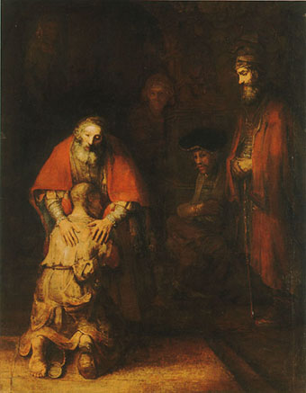 Євангельський сюжет. Лк.15:11-32. Одна з найвідоміших біблійних притч. У ній мовиться про сина заможного чоловіка, який взяв у батька свою частку маєтку, протринькав його і, коли опинився у злиднях і хворим на межі гибелі, повернувся до батька, який радісно приймає його і навіть влаштовує бенкет на його честь. Але це викликає образу і невдоволення старшого сина, який увесь час жив і працював біля батька, однак не був удостоєний такого бенкету. Батько пояснює старшому синові, що він не має причин для невдоволення, але має підставу для радості: його брат “був мертвий і ожив”. “Повернення блудного сина” - художнє втілення чуда християнської віри. Всі мальовничі засоби підкорені єдиній цілі: передати ті почуття, які змінюють світ, більше того, які слугують оправданням світу. Так Бог чекає на кожного грішника, який кається, з прощенням і любов’ю. Картина говорить про Любов Бога-Отця до молодшого сина, який спокусився несправжньою радістю зовнішньої свободи і ще не пізнав справжньої радості свободи внутрішньої - свободи від гріхів і безумства. Цю свободу людина отримує, тільки повернувшись до Бога. Тайна життя ставить усіх нас на межу спокус, і часом нестерпно тяжких. Кожен із нас проходить свою школу життя і прагне побачити, пережити у ній по можливості все. Ми поринули у нескінченне коло бажань, і від невситимості, від невдоволення, від нерозуміння часто впадаємо в розпач, а інколи - у відчай. Це знає Отець наш Небесний і тому співчуває нам, і тому з любов’ю чекає на наше повернення в Отчий Дім, звідки забрав нас сатана у своє дике царство. В любові Божій - увесь сенс життя, і тільки в ній - справжня свобода.