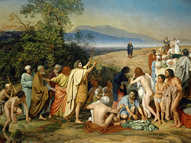 Євангельський епізод. Ів.1:31. Свідчення Івана про Месію. “І не знав я Його; та для того прийшов я, христивши водою, щоб Ізраїлеві Він з’явився”. Художнику геніально вдалося передати у процесі всі почуття, думки, рухи й одночасно завмирання, які відбувалися у дивовижний момент історії людства – явлення Христа народу. Рідкісний приклад, коли у картини змістовий центр знаходиться на дальньому плані: Ісус, Який з’являється з якогось небесного серпанку, а композиційний центр (фігура Івана Хрестителя серед людей) - на ближньому плані. Учасники картини об’єднані в групи.