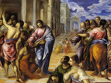 Картина. Цю картину написано в італійський період життя художника, бо він був спадкоємцем традицій візантійської школи. Виточенні, одухотворені, часом тривожні обличчя, тендітні, дивно витягнуті фігури, подібні до примар, - такі біблійні персонажі в Ель Греко. Його картинам на теми священної історії не притаманний “світський дух”, захопленість тілом, орієнтація на античні зразки. Євангельський епізод. Ів. 9:1-7. В євангельській історії явно подані дві паралельні думки сюжету: перша - значення і сенс зцілення, друга: зміна світогляду сліпого – поява і зростання його віри. Зцілення. Це, насправді, найбезнадійніший випадок. Людина і не думала про зцілення і ніколи не просила Ісуса вилікувати її. Христос сам звертає на неї увагу. Учні запитали в Ісуса: “Учителю, хто згрішив: чи він сам, чи батьки його, що сліпим він родився?” Євреї вірили, що всі найважливіші нещастя трапляються з людьми не інакше, як у покарання за їх власні гріхи або гріхи їх батьків, дідів і прадідів. Відповідаючи на питання учнів, Господь показує замість причини - ціль, для якої цей чоловік народився сліпим: через його зцілення відкрилося, що Христос є “Світло для світу”. “Син Божий прийшов, і розум нам дав” (1 Ів.5:20). “Доки Я в світі, Я Світло для світу” (Ів.9:5). Ось чому сюжет із вилікуванням незрячого, до того ж народженого сліпим, - його просвіта (фізична і духовна) - був улюбленим, починаючи з перших століть християнства аж до початку XIV століття (у середньовіччя церква забороняла зображувати тіло). Важливість цього чуда в тому, що воно було пророцтвом. Старозавітна обітниця про те, що Месія понесе наші хвороби і, що ранами Його ми зцілимося (Іс.53:3-5,10, Мт.8:17), свідомо віднесено до цілительних дій Ісуса. Тому юдеї повинні були пізнати Месію за цим зціленням. Але вони не розуміли істину того, що відбувалося і не зв’язали свою віру з Його іменем. Саме зцілення справило враження, його свідки підтвердили, що “Відвіку не чувано, щоб хто очі відкрив був сліпому з народження”. Преображення того, кого торкнувся Христос. Іван розповів про просування думки сліпого щодо Ісуса. Його роздуми проходять три стадії, і кожна нова стадія вища за попередню: - вважав Ісуса дивовижною Людиною. - назвав Ісуса пророком. - прийшов до сповідання Ісуса, як Сина Божого. Юдей, який прозрів, побачив, що людські визначення не достатні для опису Ісуса. Чим краще пізнаєш Христа, тим більше Він стає. В Євангелії від Івана чудеса завжди знак слави і сили Божої. В інших євангелістів зцілення - більше прояв співчуття Ісуса до людей. Два погляди на одну й ту саму подію, обидва базуються на вищій істині: людське страждання служить для явлення благодаті і слави Божої.