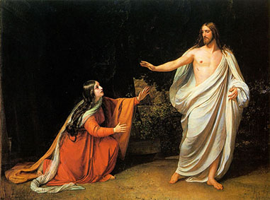 Картина. Через чотири роки після свого від’їзду до Європи Іванов створює картину, яка принесла йому успіх, звання академіка та можливість продовжувати жити в Італії. Іванов розпочав двофігурну композицію в якості наближення до теми “Явлення Христа народу”, де багато персонажів. Як сказав художник: “щоб випробувати свої сили в Італії”. Справа в тому, що Товариство заохочення художників, на чиї кошти Іванов був відправлений до Італії, не задовольнялося його проектами і обіцянками виконати грандіозну картину на оригінальний сюжет. Воно чекало від нього рішення більш скромних задач - написання полотна, яке могло б підтвердити результати закордонного пенсіонерства і стати гарантією подальших успіхів. Тому Іванов обирає один із традиційних сюжетів європейського живопису. Поривчастий рух захопленої Марії зупиняється величним жестом Христа: “Не торкайся до Мене, бо Я ще не зійшов до Отця”. Подібна композиційна зав’язка нерідко зустрічається у роботах старих італійських майстрів. Для Іванова, який шукає поворотні моменти в історії людства, явлення воскреслого Ісуса Магдалині було точкою, в якій сходилися кінці та початки християнської історії. Тому художник зосереджує увагу на емоційному боці того, що відбувається, прагнучи передати внутрішній драматизм євангельської події. Христос перебуває на тонкій межі двох світів. Прагнучи передати двоїсту природу цього явища, Іванов переживав творчі труднощі, не знаходячи пластичного подоби цьому образу ні у творах великих майстрів, ні у реальних враженнях. Художник шукає ідеального Христа для своєї картини. Відправною точкою у пошуках образу стали Аполлон Бельведерський і Христос, створений його сучасником, датським скульптором Бертелем Торвальдсеном (фігура, поза, полотно – дуже схожі). Написаний Івановим Христос своєю фізичною досконалістю нагадує грецького бога, у витонченій красі та виразних ритмах рухів, жестів та драпувань. У нього правильні риси обличчя, темне падаюче рівними локонами волосся, ніжна шкіра і в той же час мужня фігура. “Написати істинно колоритно біле плаття, яке закриває більшу частину фігури у природній розмір… справді, нелегко, - зізнався художник. - Найвеличніші майстри, здається, цього уникали. Я принаймні в усій Італії не знайшов собі прикладу. Батько істинного колориту Тіціан намагався біле плаття показувати якимось шматком, який змішався з платтями інших кольорів чи таким, який закривав тільки соромні місця наготи. Фрески не можуть бути прикладом, бо там біле плаття по суті тільки відтінені малюнки”. Картина, в якій майже зовсім немає заднього фону, поділена на частини: пластичним виразом зустрічі несумісних світів (тілесного і небесного) став контраст образа Марії та Христа. Христос у білій одежі, яка грає прозорими холодними і теплими тонами - світ горішній, і Марія, у червоному платті - грішний земний світ, обмитий Христовою кров’ю. У роботі над образом Марії Магдалини особливо наглядно проявилися творчий метод художника, його прагнення досягти граничної наочності, пластичної достовірності поведінки героїв. Щоб досягти переконливості жіночих емоцій, Іванов змушував натурщицю різати цибулю і одночасно згадувати найбільш сумні моменти її життя. Коли вона починала ридати, він смішив її, бажаючи викликати посмішку крізь сльози. На обличчі М