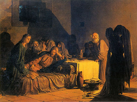 Картина. Мистецтвознавці називають цю картину найзагадковішою і таємничою у творчості Репіна. Для випускної конкурсної роботи у Петербурзькій академії мистецтв було запропоновано тему “Воскресіння дочки Яіра”, на яку давалося 6 місяців. Переможець нагороджувався Великою золотою медаллю і правом шість років жити за кордоном на рахунок державної скарбниці. Головними претендентами були два товариші: Ілля Репін і Василь Поленов. Батько Поленова був відомим дипломатом і археологом, сам Василь Дмитрович паралельно з Академією навчався в університеті на юриста. Для Репіна іншої долі, окрім як стати художником, не було: чи переможе він у цьому конкурсі, чи ні. Для Поленова, навпаки, багато залежало від того, як він впорається з конкурсним завданням. Задана тема була близькою йому, як і саме Євангеліє, тому Поленов відразу ж взявся за роботу. Тема завдання була настільки далекою Репіну, що він не хотів писати картину за євангельським сюжетом, навіть збирався залишити Академію. Художник так говорив про Євангеліє: “Мабуть, це дуже далеко від сучасності. Люди погано знають Євангеліє. Ще менше розуміють його. І зовсім не збираються йому дотримуватися”. Одного дня, коли до конкурсу залишалося вже мало часу (трохи більше 2-х місяців), художник повертався від Крамського, який всіма силами намагався пробудити інтерес Репіна до євангельського епізоду, і раптом зовсім чітко побачив сцену “Воскресіння дочки Яіра”. “Мені уявився той настрій, який був у домі, коли померла моя сестра Устя, як це вразило всю родину і дім, і кімнати – все якось потемніло, зіщулилося у горі і давило” – писав про це “прозріння” Репін. Вранці він зітер ганчіркою всю свою чотиримісячну роботу - тепер тема картини сама керувала ним. Художник узяв вуглину і став писати спочатку. “Полотно почало втягувати мене своїм понурим тоном. Надвечір моя картина була вже настільки вражаючою, що мені самому йшов мороз поза шкірою”. Щоб постійно перебувати у потрібному трагічному стані, він просив брата Василя, учня консерваторії, грати йому першу частину “Місячної сонати” Бетховена: “Музика переносила мене до мого полотна, я насолоджувався цими звуками до безкінечності, вони торкали мене до сліз”. Завершити картину вчасно Репін не встиг і зробив її на конкурс незавершеною. Недомальованою головним чином у аксесуарах першого плану (столик, чаша і нижня частина світильника, кам’яна підлога, згорнутий килим, домашнє начиння, стілець праворуч), а також у нижніх частинах фігур Христа та родичів померлої і правий куток. Але і в такому вигляді вона викликала фурор на конкурсі, мистецтвознавці говорили, що картина вийшла по-бетховенськи потужною, до того ж в її оцінці збігалися і професори Академії, і противники академічного живопису. Залишалося чекати на рішення жкрі: чия картина переможе. Поленов згадував: “Я прийшов до майстерні Репіна і сів на кушетку в очікуванні долі…” Тут двері відкрилися навстіж, і увійшов їх спільний друг: “Ну, брати, вітаю!”. Рішення журі було неочікуваним: вони обидва отримали Золоті медалі та обидва змогли поїхати за кордон. Картина Репіна відразу ж стала шедевром, можливо, він піднявся в ній на таку духовну висоту, яка більше не зустрілася в його творчості. Коли пережите було на деякому віддаленні, Репін був вражений тим, як мало, по суті, змінилися люди з