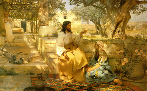 Картина. Навесні 1887 на щорічній виставці Петербурзької імператорської Академії мистецтв Генріх Іпполітович виставив цю велику, щойно написану картину. Чергове полотно почесного академіка було прийняте неоднозначно: колеги боролися, публіка захоплювалася, керівництво присудило звання (картину не гаючи часу придбали для Академії, а потім передали до музею Олександра III), преса писала: “фурор, якого у нас і не пам’ятають”. Картина стала визнаним шедевром. Сюжет картини зовні простий: на тінистій веранді сидить Христос, біля ніг Якого примостилася юна Марія, яка слухає Вчителя. Але за цією простотою прихований глибокий філософський зміст, який художник зміг майстерно передати. Всупереч всій західній традиції, він розставляє акценти зовсім інакше: на першому плані Марія, яка думає про вічне, і тільки десь далеко, промальована гірше за пейзаж, Марта. Пейзаж відіграє головну роль у картині, фігури жінок й Ісуса хоч і перебувають на передньому плані, все ж не можуть затьмарити враження, залишеного глядачеві майстерно вималюваним пейзажем.