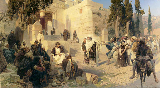 полотно/олія, 325х611, Російський музей, Санкт-Петербург. Художник. Більше за все Поленов відомий як пейзажист, автор таких картин, як “Московский дворик”, “Бабушкин сад”, “Заросший пруд”, але ще у юнацькі роки під враженням картини Олександра Іванова “Явлення Христа народу” у нього зародилася ідея створити велике полотно етичного змісту, здатне впливати на глядача силою свого драматизму. На думку художника, саме такий твір відповідав би попиту часу, духовним потребам людей. До вісімдесятих років XIX століття у російському мистецтві вже склалася нова традиція звернення до євангельських сюжетів як до історичних подій, що реально відбувалися, з акцентуванням на моральному боці християнства. І Поленов вважав головною справою свого життя цикл картин “З життя Христа” - задача створення полотен великого виховного значення. Поленов писав: “Я невимовно люблю євангельське оповідання, люблю цю правдиву розповідь, люблю цю чистоту і високу мораль, люблю цю незвичайну людяність, якою наскрізь просякнуте все вчення Христа. В євангельських сказаннях Христос є справжньою живою людиною, або Син Людський, як Він постійно Сам Себе називав, а за величчю духу Син Божий, як Його називали інші, тому справа в тому, щоб і у мистецтві дати цей живий образ, яким він був у дійсності”. Він поставив собі задачею викласти у картинах всю трагічну повість про Христа, від його народження до Голгофи, і почав виконувати цю величезну працю. Наче вступом до цього циклу картин стала “Христос і грішниця”, написана Поленовим після першої подорожі до Палестини. Написанню картини передували поїздки до Єгипту і Палестини, вивчення побуту, норову і колориту стародавньої Юдеї. Перші ескізи було зроблено під час пенсіонерської (оплаченої Академією мистецтв) поїздки. Для відтворення історично правдивих умов, за яких відбувалися події, пов’язані з життям і діяльністю Христа, Поленов у 1881-1882 роках здійснив подорож по Єгипту, Сирії, Палестині, заїхав по дорозі до Греції. Він створив безліч етюдів, вивчав характер місцевості і типи населення, архітектурні споруди в їх співвідношенні з оточуючою природою. Його палітра заграла новими звучними фарбами, новими співвідношеннями кольорів. Він зміг увібрати в себе відчуття своєрідності світлоповітряного середовища Сходу, що назавжди залишилося у його картинах і відмічене ледве не всіма критиками. Поленов працював чистими фарбами, не змішуючи їх на палітрі, просто на полотні знаходив точні кольорові співвідношення, досягаючи небувалої у російському мистецтві сили звучання кольору. Але для здійснення задуму Поленова цього було недостатньо. Він продовжував збирати необхідний йому матеріал і в наступній подорожі між першими етюдами до картини (1872) і закінченням полотна минуло п’ятнадцять років. Таким чином, він повторив шлях Олександра Іванова, картина якого так сильно вразила його у ранньому віці.