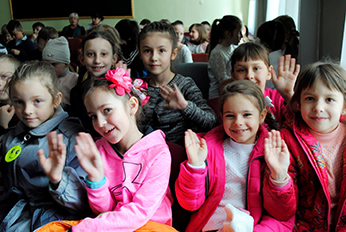 Зайчик Баня знайомиться з дітками, які відвідують церкву в місті Фастові