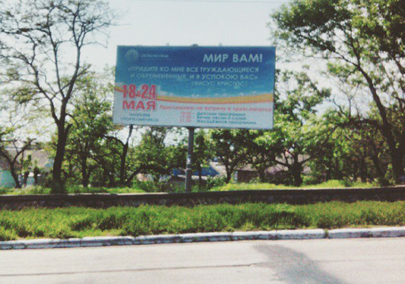 Перша наша євангелізація з храм-наметом відбулася у м. Бердянськ (18 – 24.05). Ще до нашого приїзду брати і сестри помісної церкви ретельно підготувалися до тижневої євангелізації: розмістили рекламу на місцевому ТБ, радіо та на 7-ми бігбордах по всьому місту.