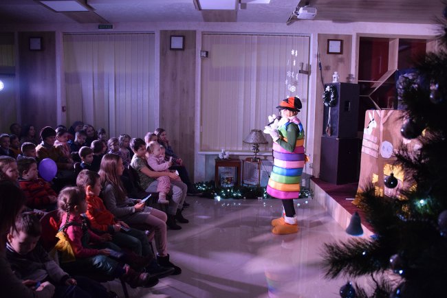 Львівський дитячий будинок сімейного типу зустрів нас дзвінким сміхом дітей, які бавилися в снігу, смачними ароматами обіду та затишною вітальнею. У цій родині виховують 17 дітей. Доки ми встановлювали декорації, діти встигли потоваришувати з двома нашими співробітниками: бігали, сміялися, грали, розпитували про них і розповідали про себе. Та щойно розпочалася вистава, із вертких та гіперактивних дітлахів вони перетворилися на уважних глядачів, цілковито занурених у дійство.