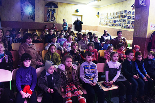 Наприкінці заходу працівниця Будинку культури скористалася тим, що зібралося так багато дітей (з чого ми раділи, адже ніхто не очікував побачити стільки глядачів), і оголосила про місцевий конкурс малюнків. Дітям запропонували зобразити те, що вони хотіли б отримати на День святого Миколая. Переможці конкурсу отримають у подарунок те, що вони намалювали. Наша співробітниця випадково почула, як дівчинка підійшла до жінки, що робила оголошення, і запитала: «А можна намалювати електрику?» (Місцеві служителі нам розповідали, що часто ввечері і вночі в усьому селищі вимикають світло, щоб місто не було видимим і його не обстрілювали).