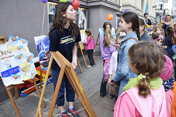 Цього року ми зустрічали наших маленьких глядачів ще на вулиці. Юля Собко, керівник дитячого кореспондентського курсу «Іди за мною», приготувала інтерактивну програму, щоб розказати дітям про школу «Стежинки». Адже кожна дитина, навчаючись за програмою курсу, може дізнатися безліч цікавого й знайти у Біблії відповіді на всі запитання, які її непокоять.